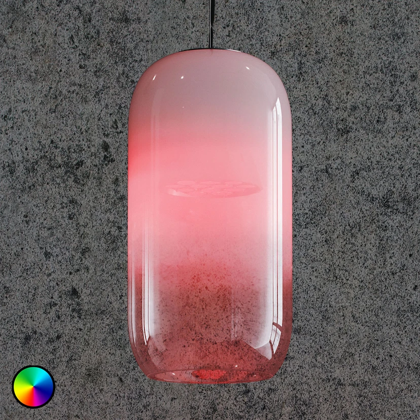 A Gople függőlámpa RWB egy izgalmas és innovatív lámpa. A gyönyörű szájjal fújt üveg egy ősi velencei technikával készül, amely fokozatosan átalakítja az üveg színét. Ezért minden lámpa egyedi színű, és formája is kissé eltérhet. A lámpa egyszerű formája kiemeli a gyönyörű színjátékot és az innovatív kivitelezést.